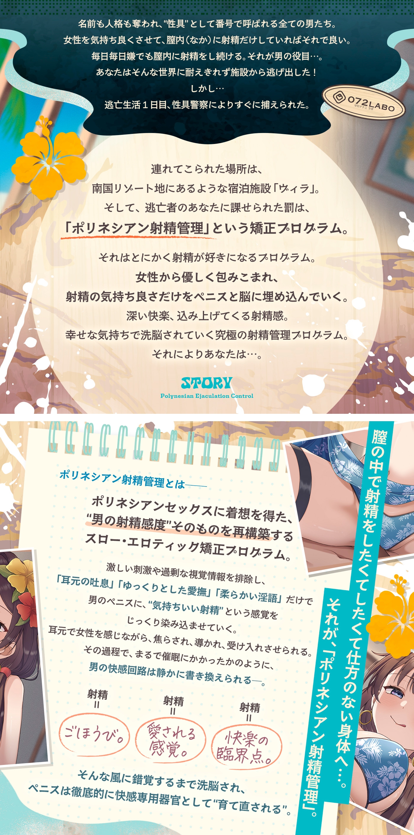 連れてこられた場所は、南国リゾート地にあるような宿泊施設「ヴィラ」。そして、逃亡者のあなたに課せられた罰は、「ポリネシアン射精管理」という矯正プログラム。それはとにかく射精が好きになるプログラム。女性から優しく包みこまれ、射精の気持ち良さだけをペニスと脳に埋め込んでいく。深い快楽、込み上げてくる射精感。幸せな気持ちで洗脳されていく究極の射精管理プログラム。それによりあなたは…。