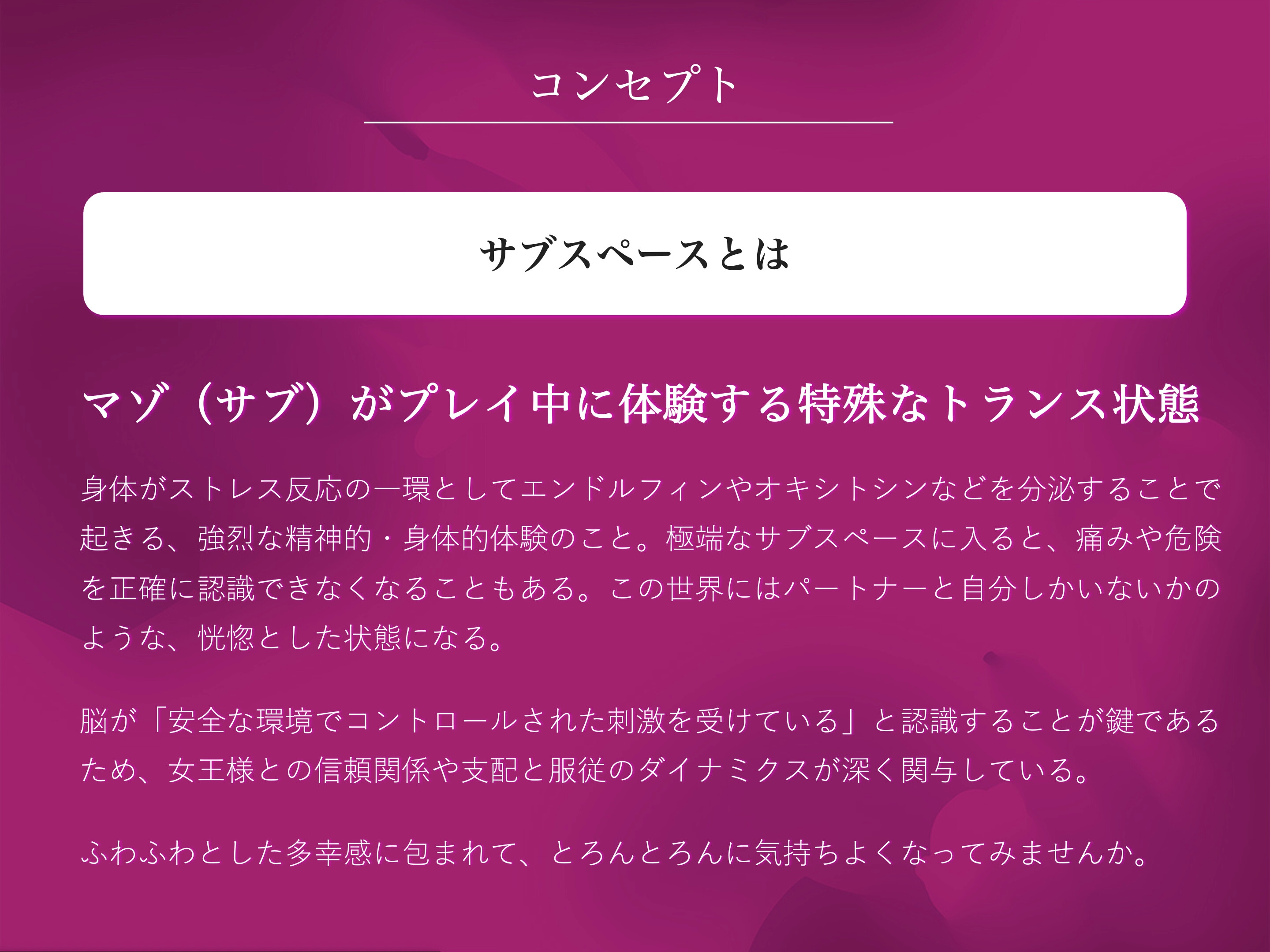 SMプレイ中にマゾが入る特殊なトランス状態「サブスペース」を味わうことができる音声です。