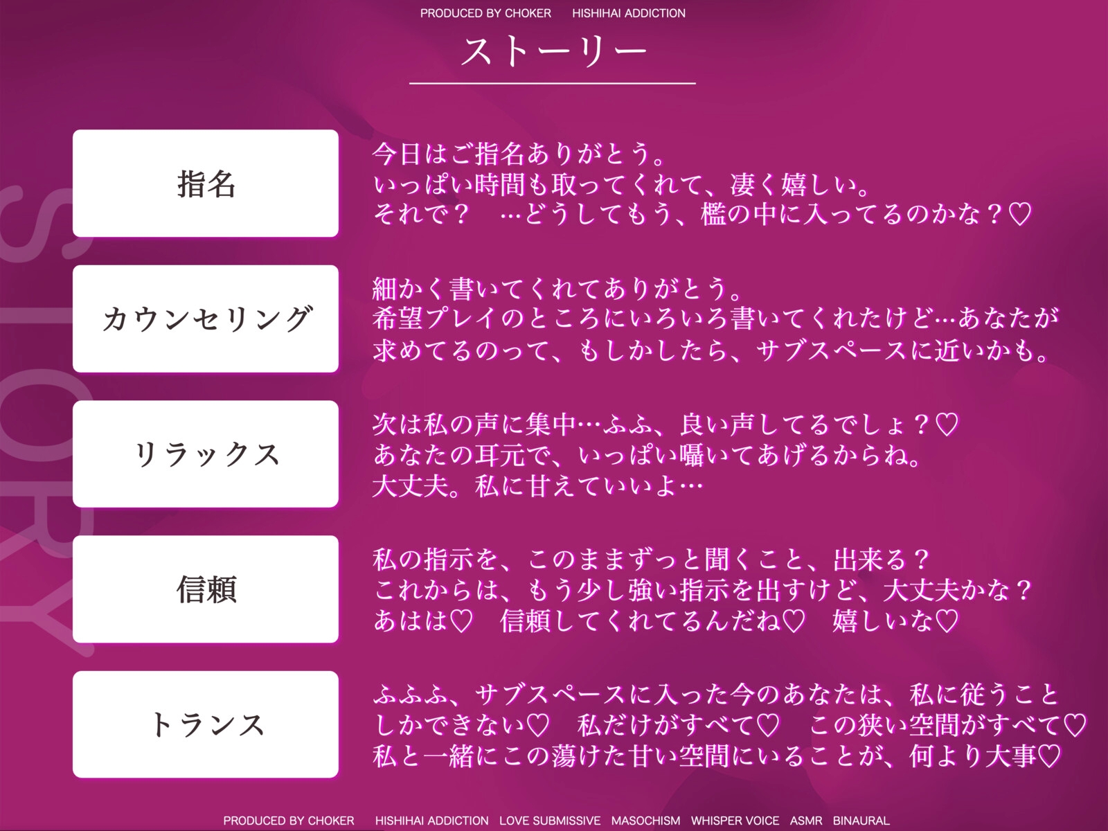 ジャンルSM しつけ 言葉責め 焦らし トランス/暗示 耳舐め ささやき 乳首責め