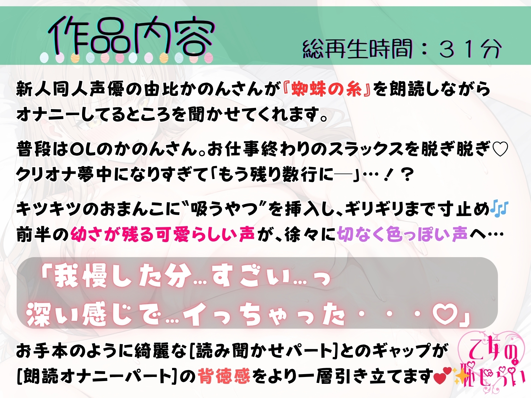 新人同人声優の由比かのんさんが『蜘蛛の糸』を朗読しながらオナニーしてるところを聞かせてくれます。