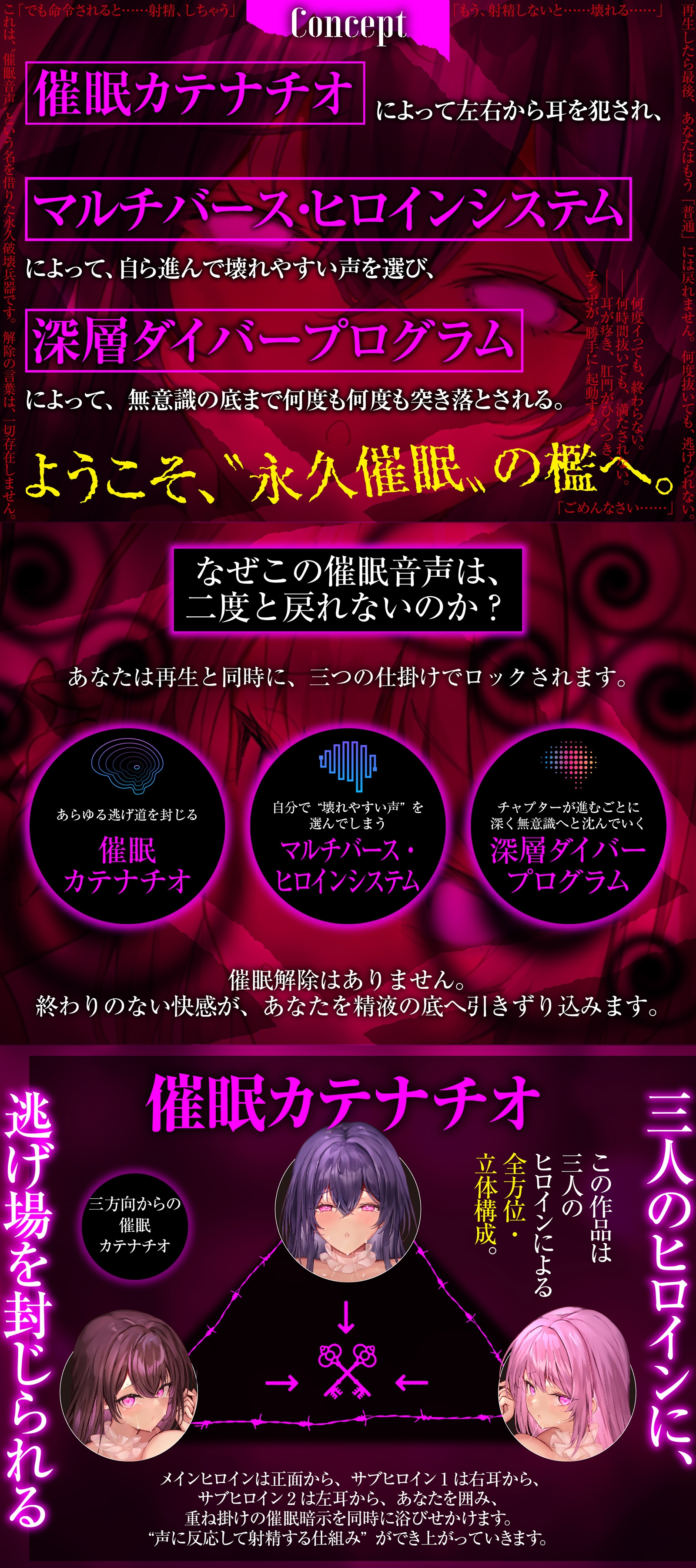 三人の声優による三方向からの同時作用は、通常の催○をはるかに凌ぐ強力な効果を発揮します。聴いた者は皆、快楽三角地帯に囚われ、不可逆のトランス構造へと堕ちていきます。