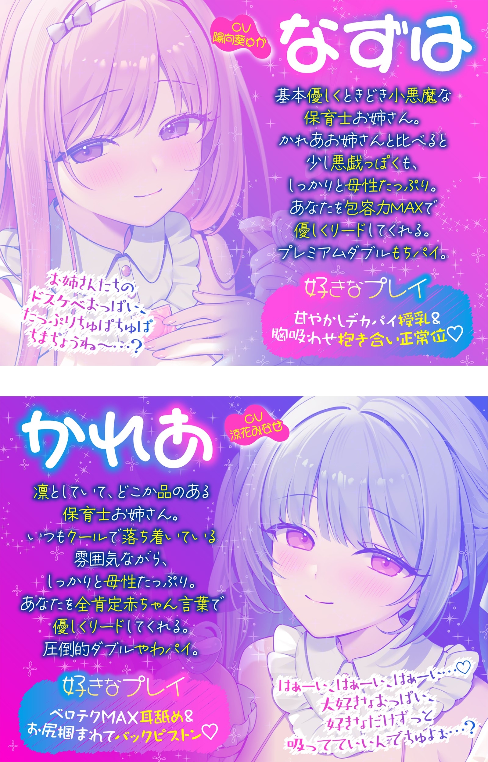 オスを誘惑する色白長乳をぶら下げた、なずはお姉さん&かれあお姉さんの保育士さんタッグに優しくご奉仕してもらいながら甘々な雰囲気でバブみ堪能♪