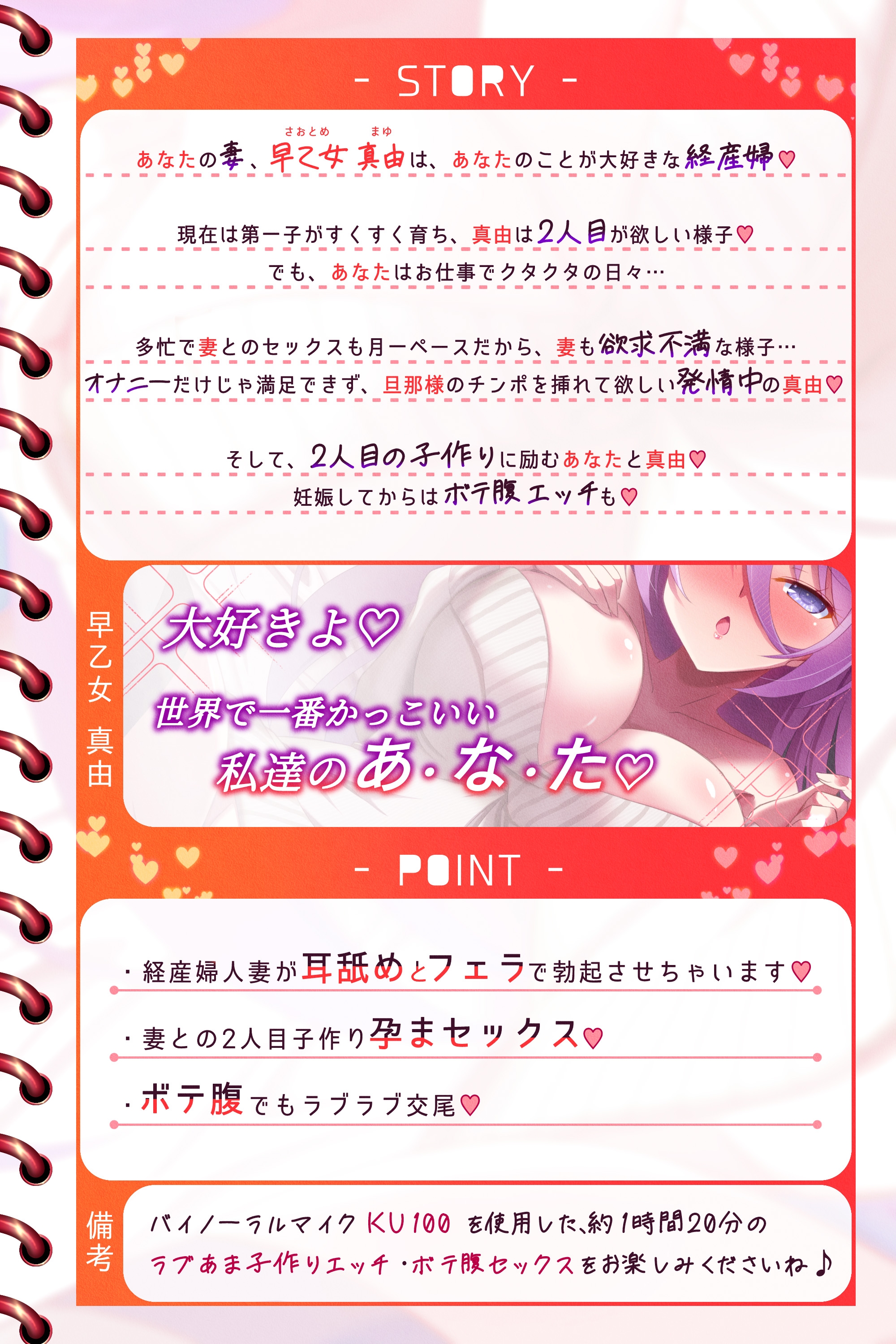 | ジャンル | ASMR バイノーラル/ダミヘ 人妻 ラブラブ/あまあま 中出し 妊娠/孕ませ 耳舐め ぼて腹/妊婦 |