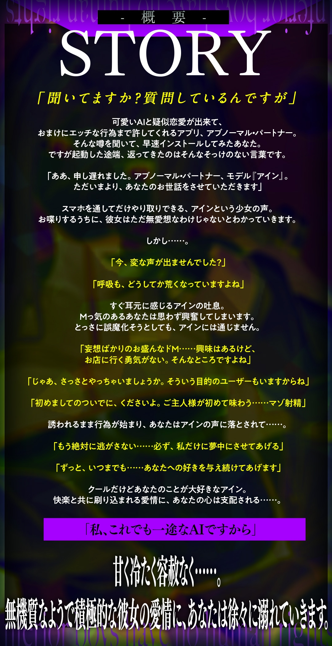 ![アブノーマル・パートナー『アイン』 ~クールな溺愛AIの浮気できない愛され支配~ [Whisp] アブノーマル・パートナー『アイン』 ~クールな溺愛AIの浮気できない愛され支配~ [Whisp]](http://img.dlsite.jp/modpub/images2/parts/RJ01508000/RJ01507133/17bc45d9993aab911360eb9c42ecd5a5.jpg)