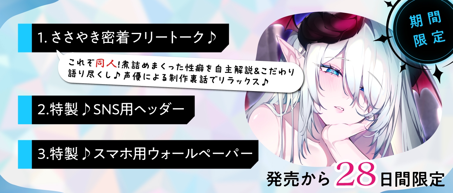 | ジャンル | バイノーラル/ダミヘ サキュバス/淫魔 オナサポ 言葉責め 男性受け 乳首責め 本番なし 耳舐め |