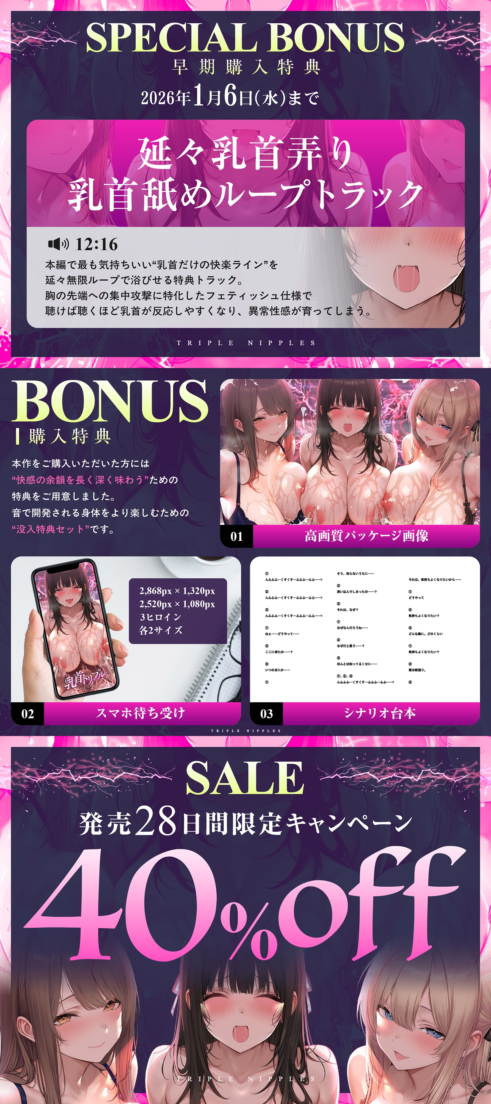 本作は、音そのものが意識を変性させる「サウンドドラッグ技術」を核にした、乳首開発特化のプログラムです。