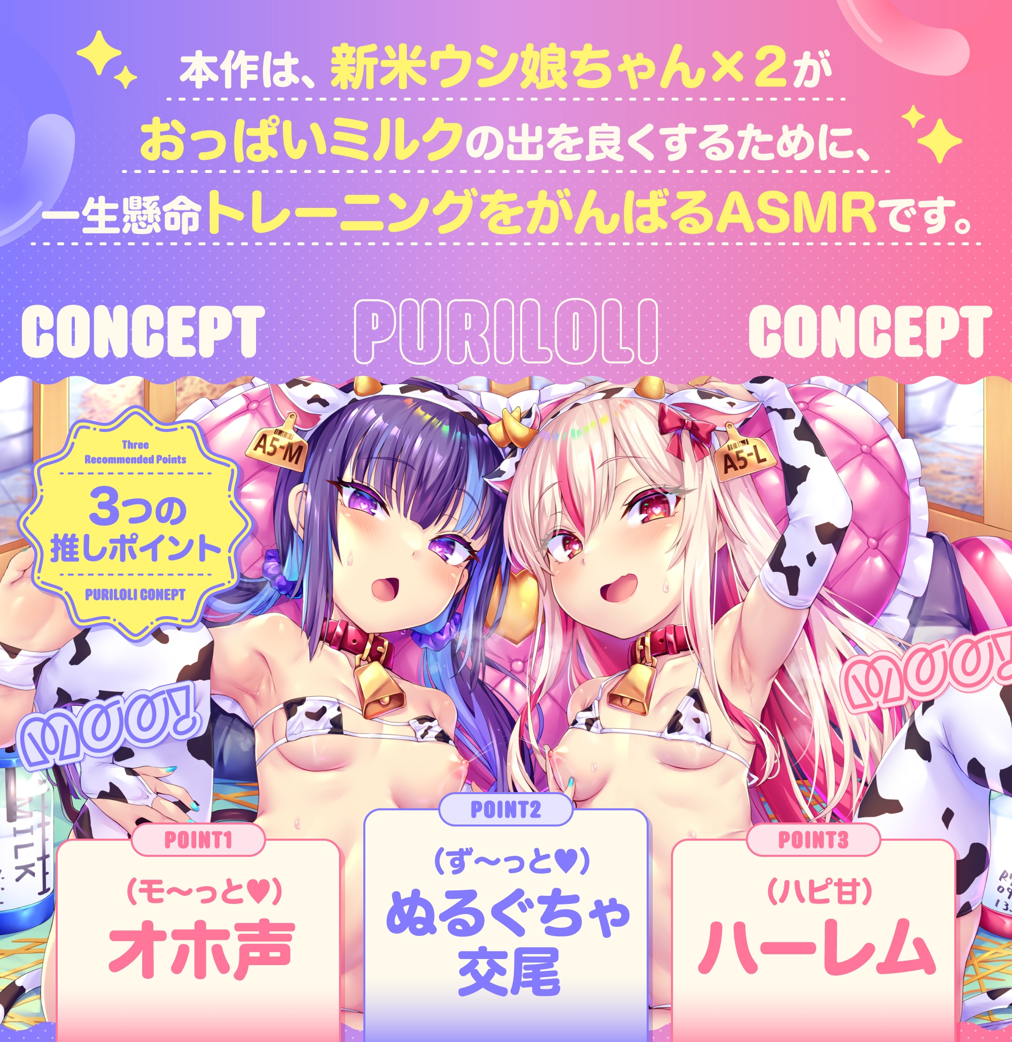 本作は、新米ウシ娘ちゃん×2がおっぱいミルクの出を良くするために、一生懸命トレーニングをがんばるASMRです。
