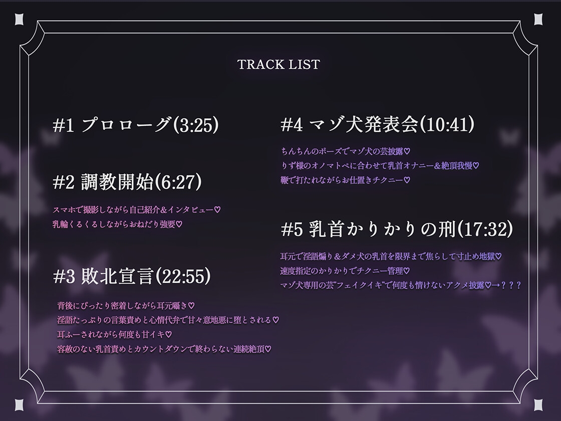 ヒロインがあなたの乳首を責めるのはもちろん、オノマトペに合わせて乳首オナニーをするように命令されたり、首輪を付けられてマゾ犬として躾けられたり、羞恥プレイや心情代弁、淫語たっぷりの言葉責めで甘々意地悪に堕とされてしまいます……♡