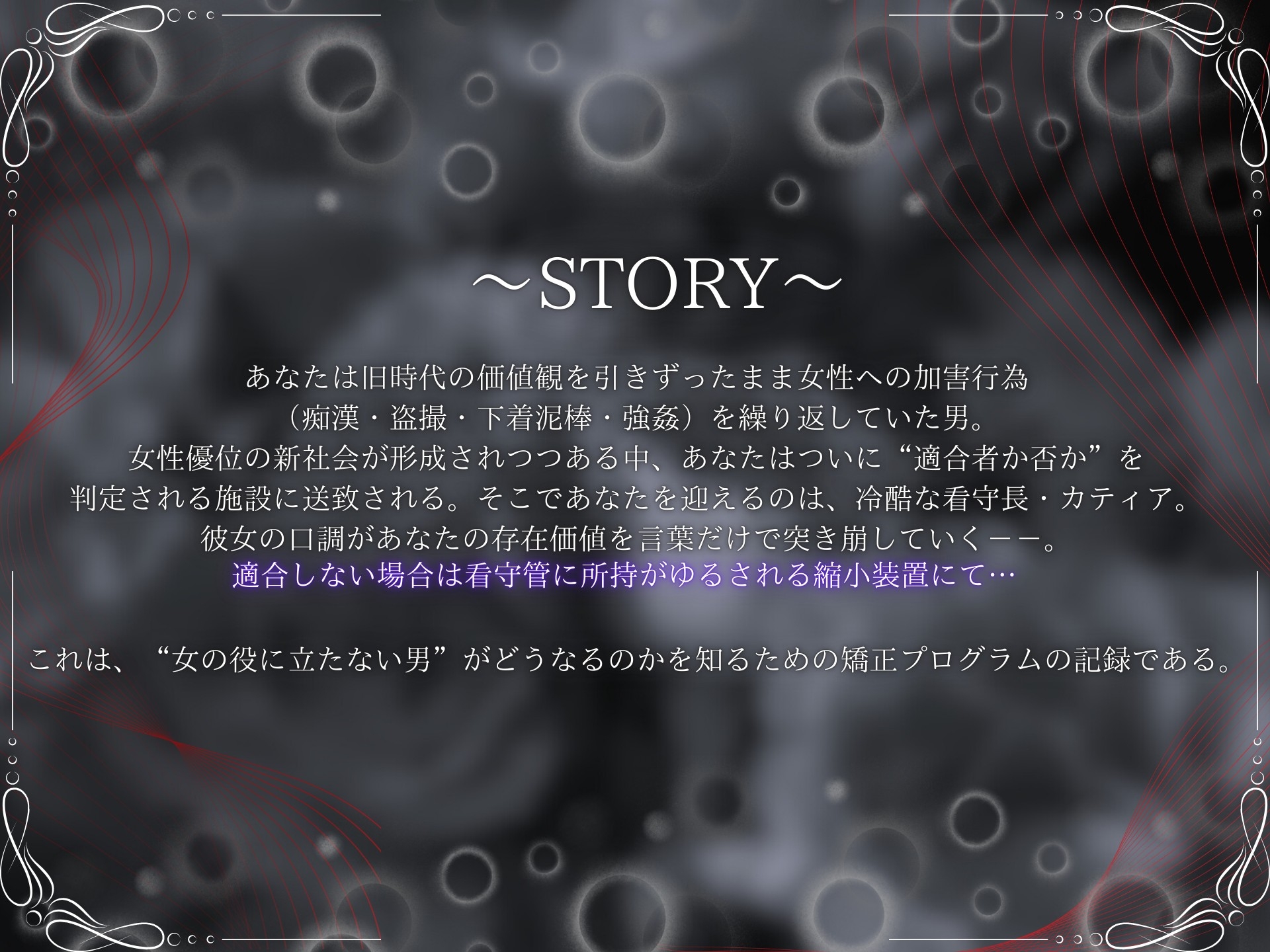 「評価」「管理」「処分」という管理社会的な設定を軸に、クズな主人公が抵抗できない状況へ追い込まれていく過程や、尊厳を崩していく心理を重視した構成になっています。
