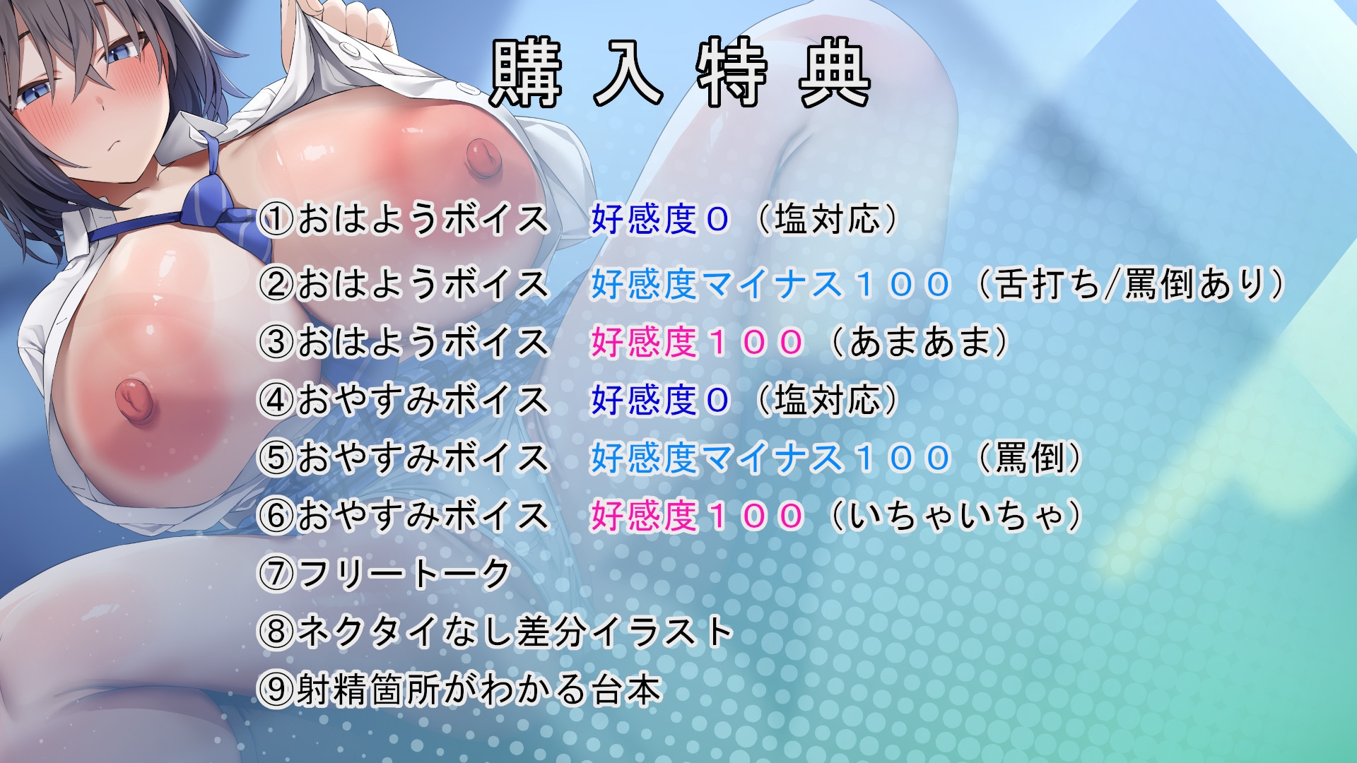 【好感度0/耳元密着/ダウナー囁き/スロー手コキ/耳元吐息/乳首舐め/乳首吸い/事務的ご奉仕/カウントダウン/射精/精液を嗅ぐ】