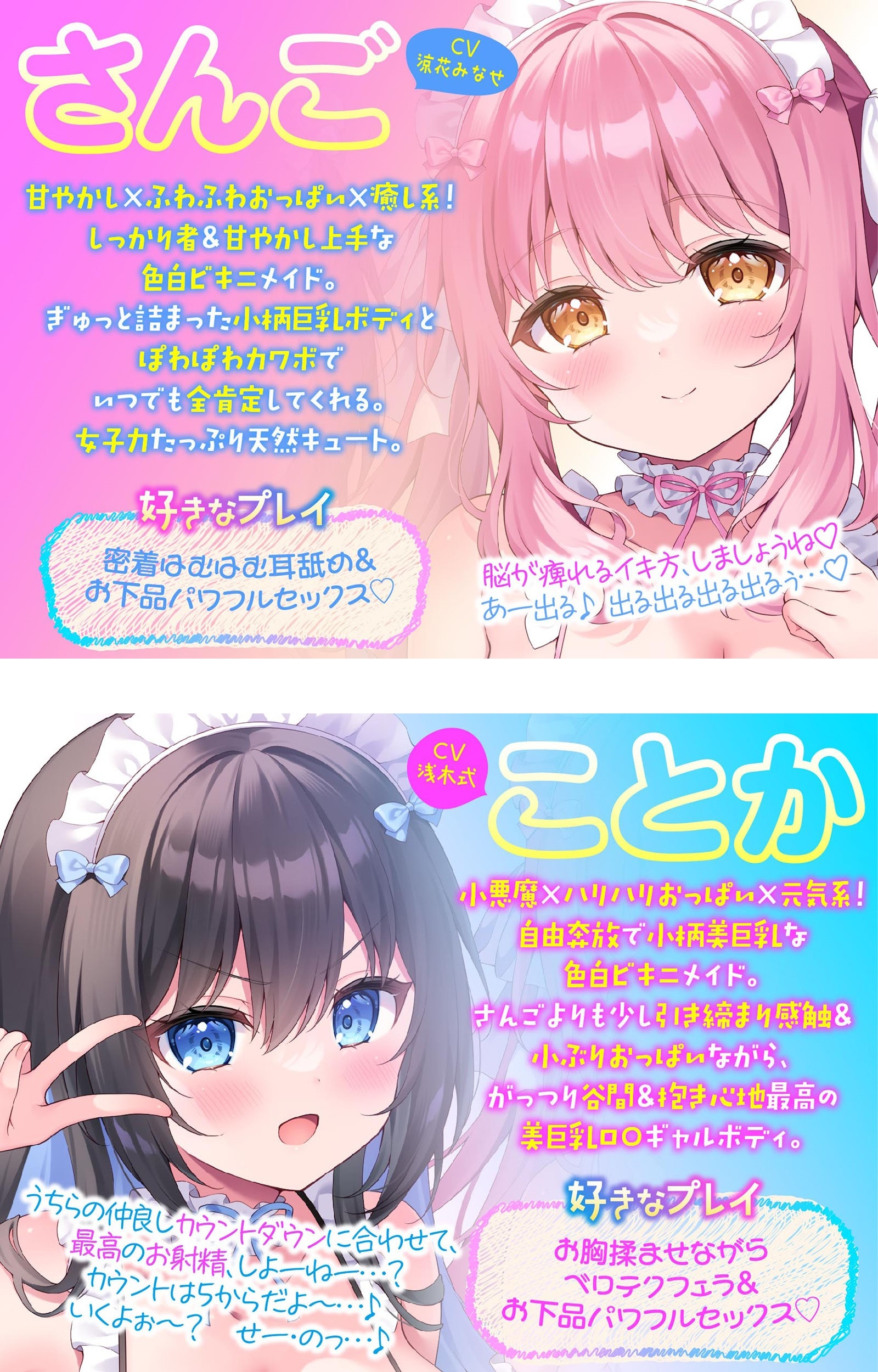 お屋敷のお庭の屋外プールで、ボディメイク完璧なビキニメイド"さんご&ことか"の仲良しタッグと楽しく遊べちゃうバイノーラル音声作品です♪